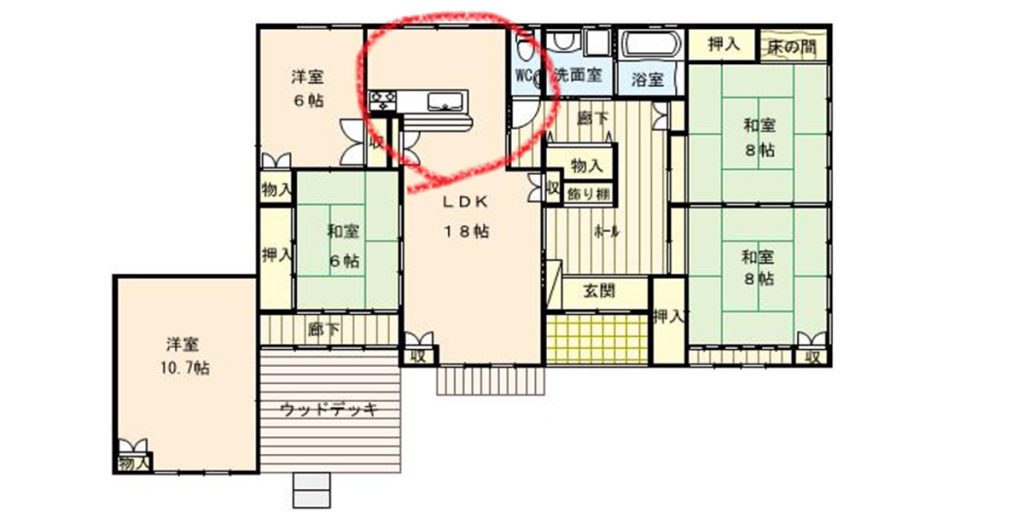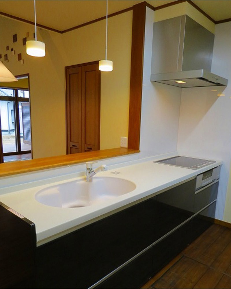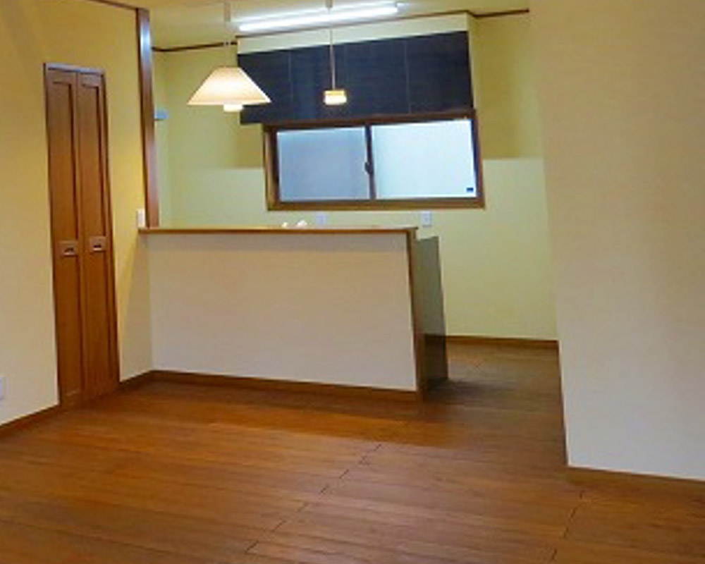 ポイント 元々はダイニングとキッチンが分かれていた間取りを、ダイニングにキッチンを移動し、より使いやすい間取りに。カウンターキッチンを設置し、オシャレで解放感のある間取りへと生まれ変わりました。 今まで仕切りや壁などがあり暗い住宅が明るい住宅へとリセットされました! 今までキッチンだった部分は納戸との仕切り壁をなくし、洋室へと生まれ変わらせています。 使いづらい間取りをリセット!空間を有効活用した間取り変更 施工前 仕切り壁に囲まれ、手狭になっているダイニング 施工後 オール電化仕様でお手入れも簡単なカウンターキッチン リビングから見ても解放的なキッチンに仕上がりました