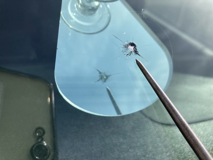 走行中に突発的に飛んでくる石などが、フロントガラスに衝突することにより数センチ程度のヒビができることがあります。