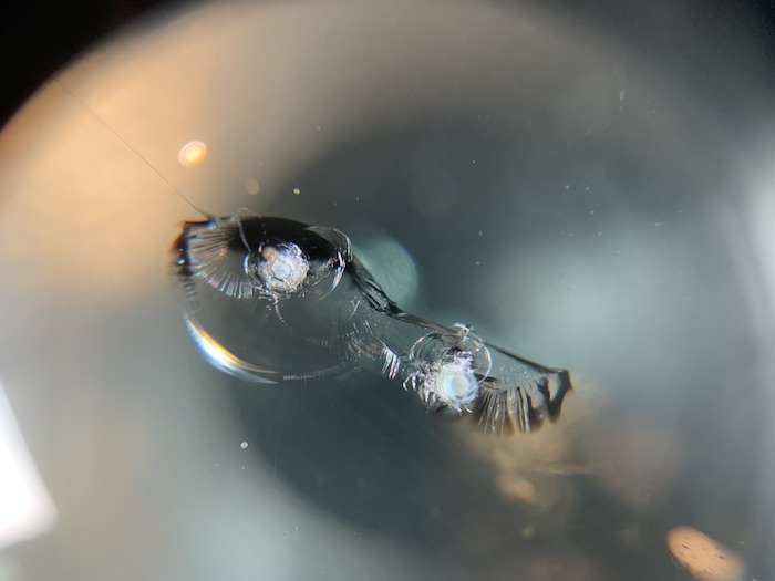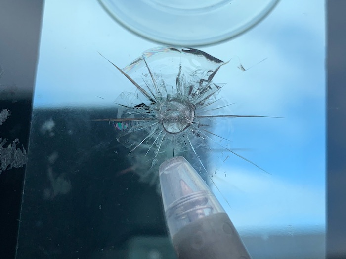 このヒビは、くぼみ(衝撃点)2ヶ所のパーシャルブレイクと言います