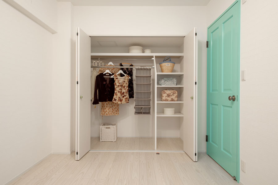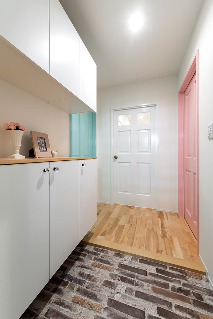 フローリングはトレンドのラスティックな無垢材を使用し、建具は無垢材にパステルカラーを塗装してアンティーク調の取っ手を取付るなど、自分の“好き”に囲まれた部屋づくりを楽しんだインテリアになりました。