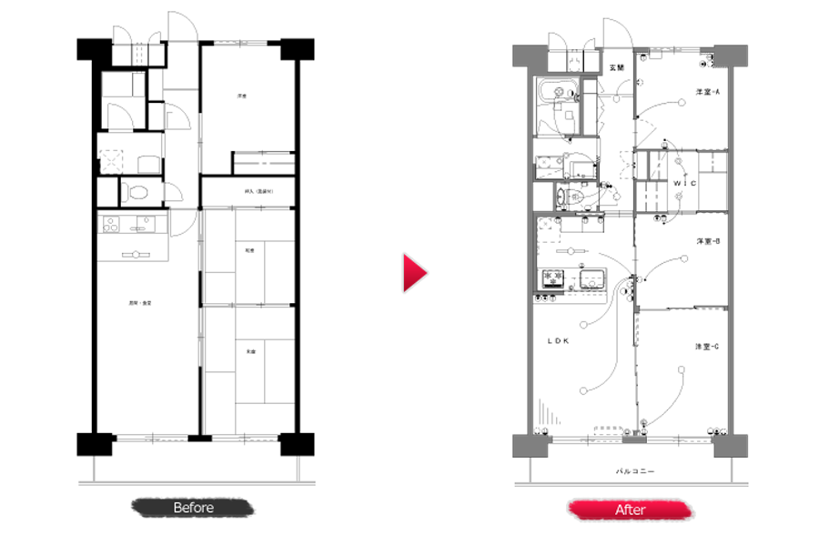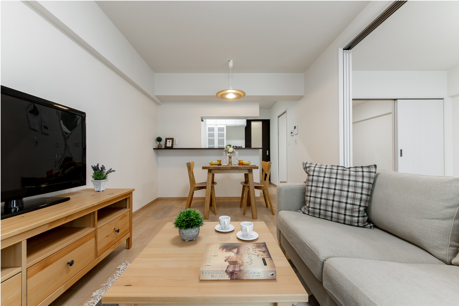 家族構成の変化にも対応できるよう間仕切り戸を設置し、家族が集う時には広々としたLDKとして使用できるようにしました。南側から北側へ風が通り道を設けて換気できるようプランしました。収納スペースをまとめる事でスッキリと片付けしやすくなりました。