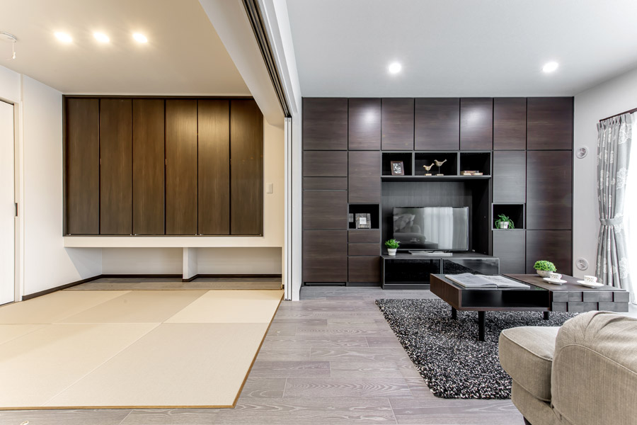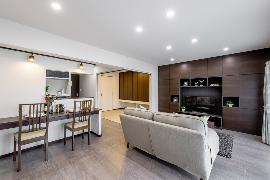 落ち着いた色合いと間接照明を上手に使った大人のモダンイテリアです。