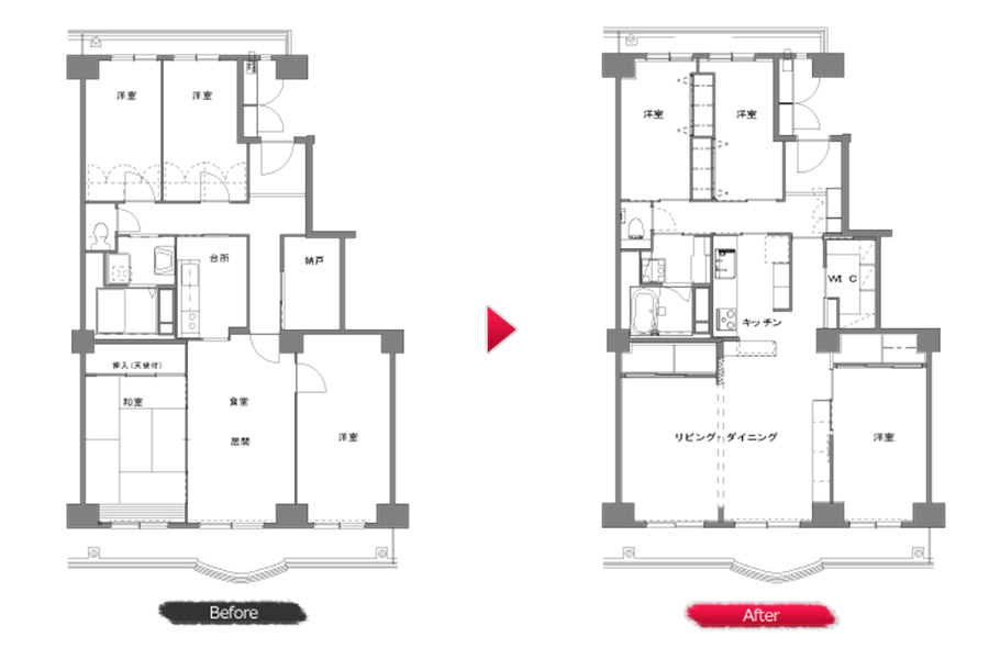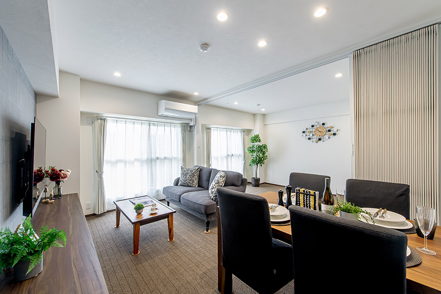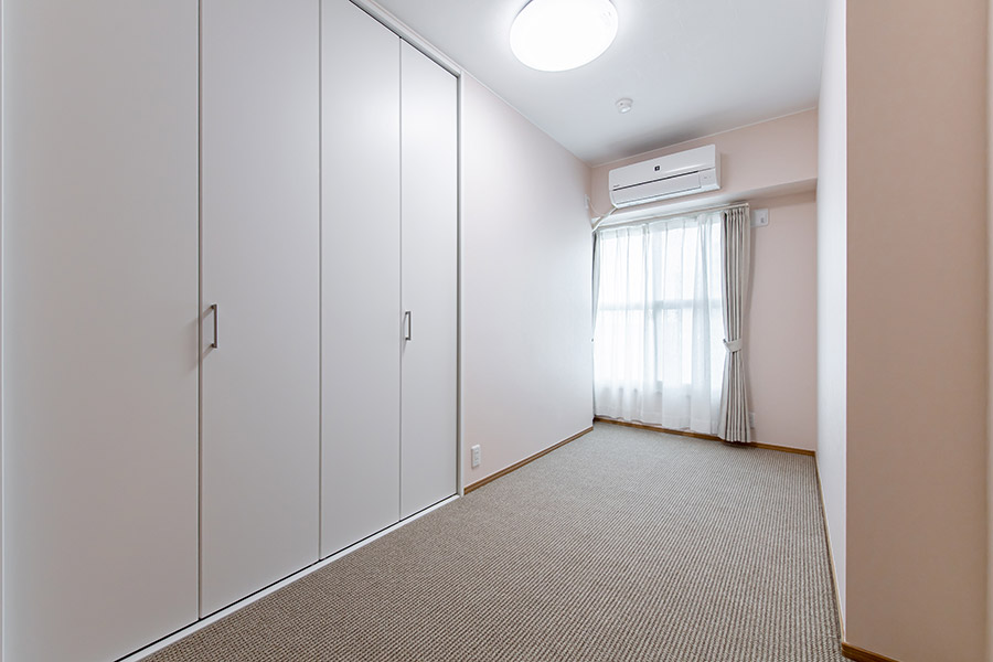 南側の和室はカーペットにして、広いリビングになるよう間取りを変更。解放感のあるリビングは自然と笑顔が増え会話も弾みます。すべての窓に二重サッシを取り付けて、防音、結露対策を施しました。断熱効果が高く部屋の温度を一定に保つため、いつでも快適で省エネな暮らしを実現しました。各部屋にクローゼットを設け、スッキリ収納できるようにしました。生活動線を考慮した収納計画で、片付け易く居心地の良い住まいに。